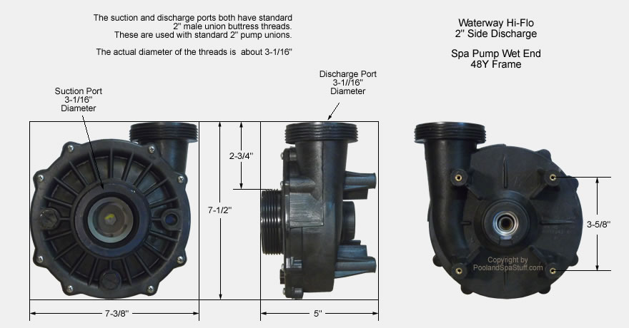 Side discharge, 2"mbt suction/discharge, 48 frame wet end for the Waterway Hi-Flo pump. This wet end is used with a 3.0hp, 48 frame, thru-bolt style motor. The motor used may be either a single or dual speed. The wet end may be rotated 90° to change the discharge position. The complete wet end includes: the volute, seal, impeller, wear ring, suction cover, suction cover o-ring, drain plug, drain plug o-ring and suction cover screws. Motor and unions sold separately.